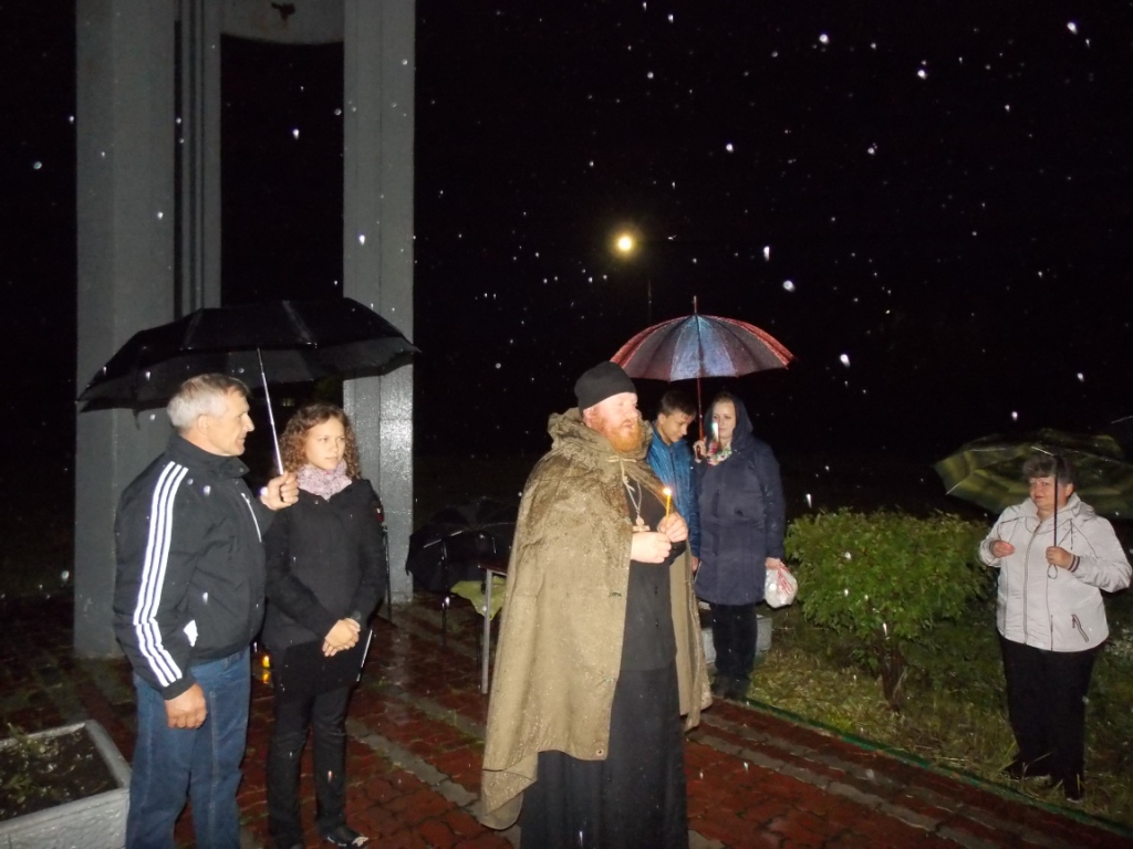 К присутствующим обратился отец Олег, настоятель прихода Казанской иконы Божией Матери: «В этой тишине хочется поразмышлять о том, что прежде чем нажимать курок, прежде чем начинать войну мы все должны задуматься о тех последствиях, которые принесет война. Во второй мировой войне больше всего жизней отдали русские люди, более 20 млн. человек, это страшная цифра, в каждой семье есть свой герой. И в этот день особенно хотелось поклониться русскому народу, простому солдату, который ценой своей жизни защищал Отечество, встал грудью на пути врага. Врага, который зажег весь мир, хотел изменить обычный добрый порядок вещей. И в этот день также хотелось вспомнить и подумать о том, что творится сейчас на Украине. Как будто те люди, которые разжигают войну междоусобную в нашем родном народе, чтобы они помнили о тех жертвах, которые могут быть после всех этих событий».